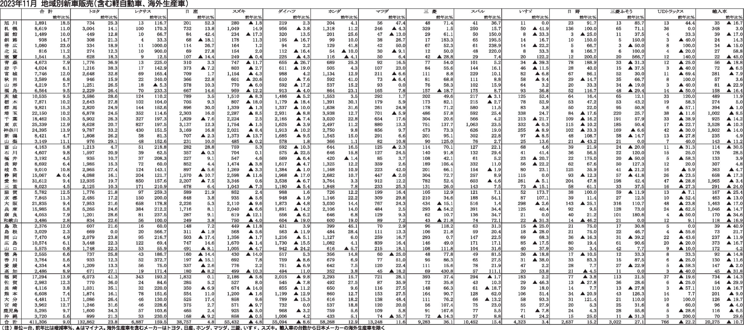 〈2023年11月 地域別新車販売(含む軽自動車、海外生産車)〉