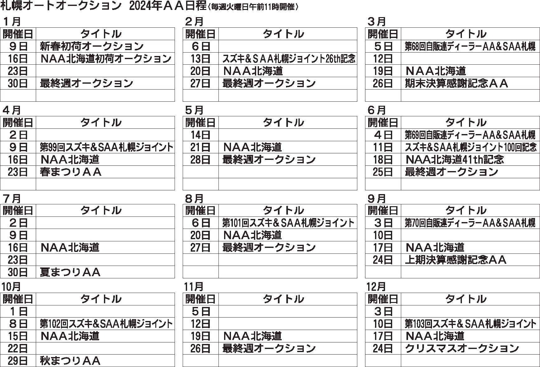 札幌オートオークション(SAA、土谷州治社長)は、2024年中古車オークション(AA)日程をまとめた。年初は1月9日からスタートし、SAA単独での記念AAをはじめ、スズキや自販連との合同AA、毎月第3週をめどに実施するNAA北海道などを計...