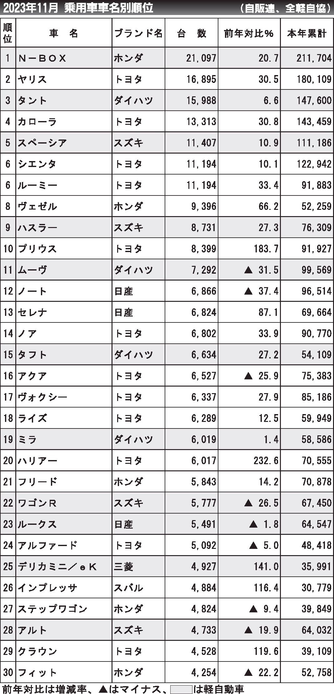 〈2023年11月 乗用車車名別順位〉