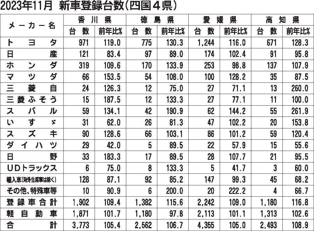 四国地区2023年11月の新車販売台数(含軽自動車)は、前年同月比6・2%増の1万3183台となり、15カ月連続で増加した。 同月は登録車、軽自動車とも前年を上回ったが、軽自動車の伸び率が鈍化傾向にあるのに加え、12月下旬からのダイハツ車...