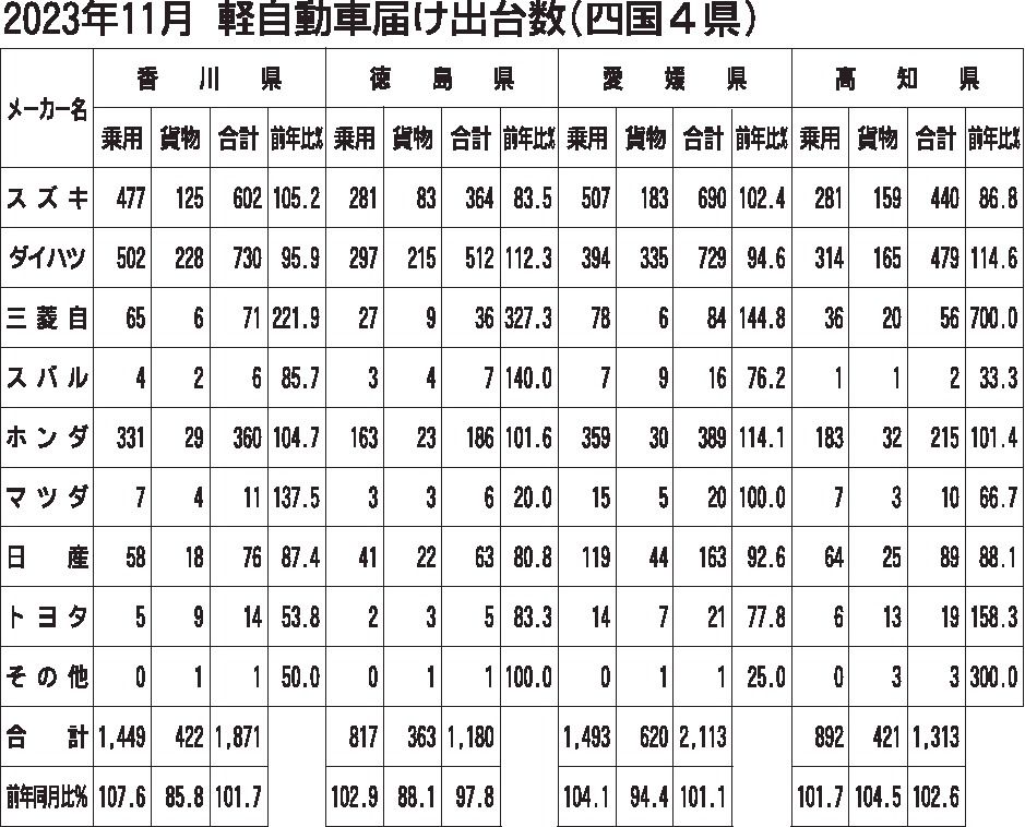 四国地区11月新車、15カ月連続プラス 軽の伸びが鈍化傾向