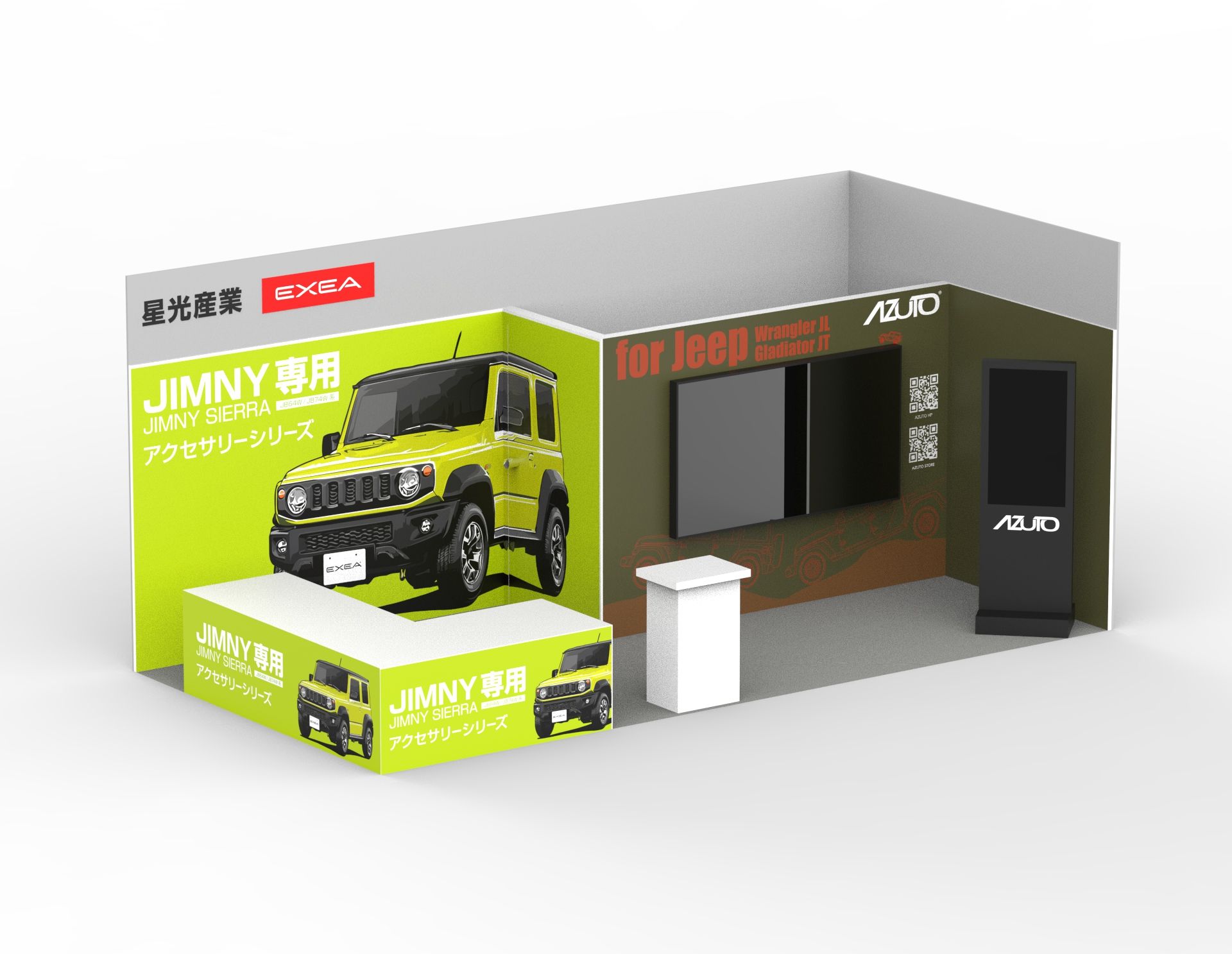 エクセアのブースにはジムニーシエラのデモカーを展示。車種専用品を装着した車両を用意することで、使用時のレイアウトや使い勝手を体感することができる内容とする。
