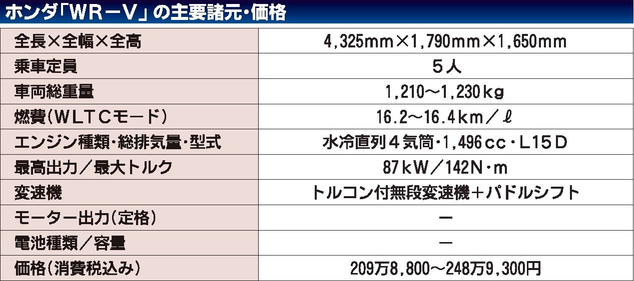 ホンダは、小型SUV「WR―V」を3月22日に国内市場に投入する。小型SUVの「ヴェゼル」と同等サイズだが、装備を簡素化するなどしてヴェゼルよりも30万円ほど安く設定し、ホンダのSUVのエントリーモデルと位置付ける。ホンダとして初めてイン...