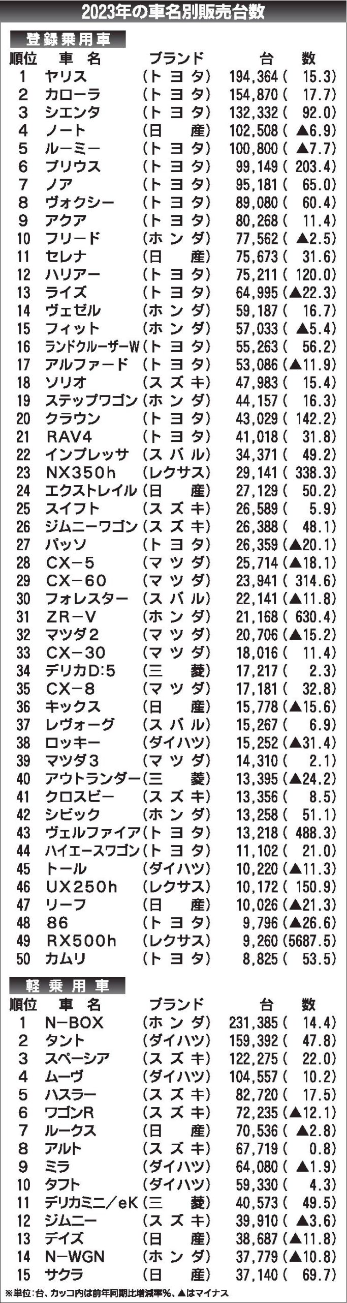 2023年の国内新車販売ランキング、N-BOXが2年連続トップ 唯一の20万台超
