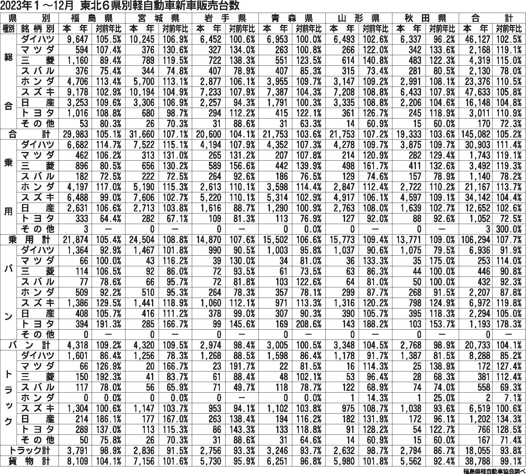 〈2023年1~12月 東北6県別軽自動車新車販売台数〉