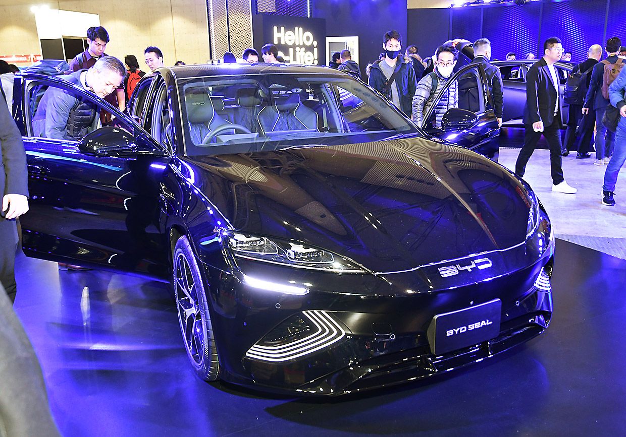 BYDオートジャパン(東福寺厚樹社長、横浜市神奈川区)のブースも多くの来場者が集まった。EVの「ドルフィン」と24年春に導入予定のセダン「シール」の2台を展示し、「BYDブラック」をテーマに、ブースとユニフォーム、車両を黒で統一した。青いブース照明と組み合わせて独特の世界観を演出していた。