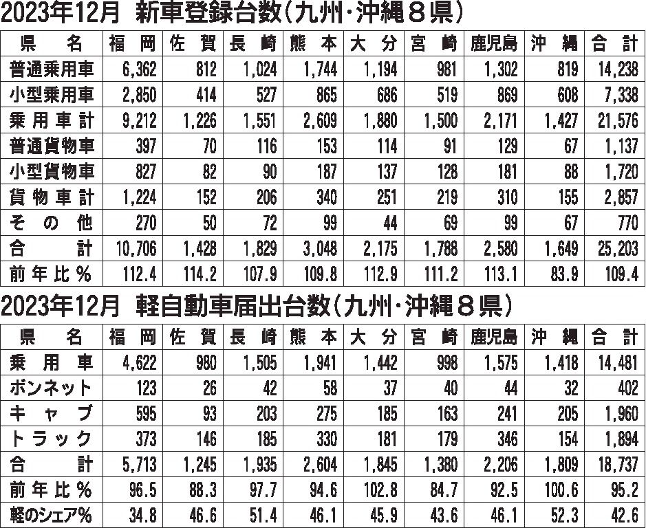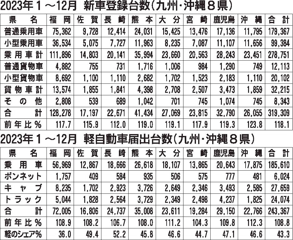 2023年(1~12月)の九州・沖縄地区の新車販売台数(登録車と軽自動車の合計)は、前年比13・9%増の56万2676台となり、5年ぶりに前年実績を上回った。前年の50万台割れから7万台弱の台数増を果たした。半導体不足の緩和による生産量の...