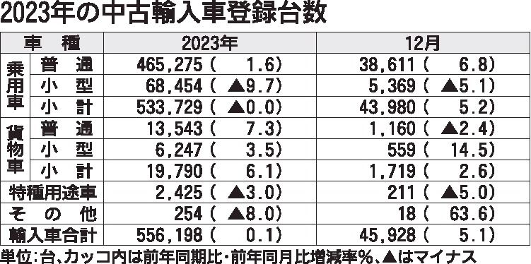 日本自動車輸入組合(JAIA、上野金太郎理事長)が17日発表した2023年の中古輸入車登録台数は55万6198台(前年比0.1%増)と3年ぶりに前年を上回った。新車の納期遅延が改善し、7月以降は単月ベースで6回中、4回が前年超えを記録するなど、確実に回復している。