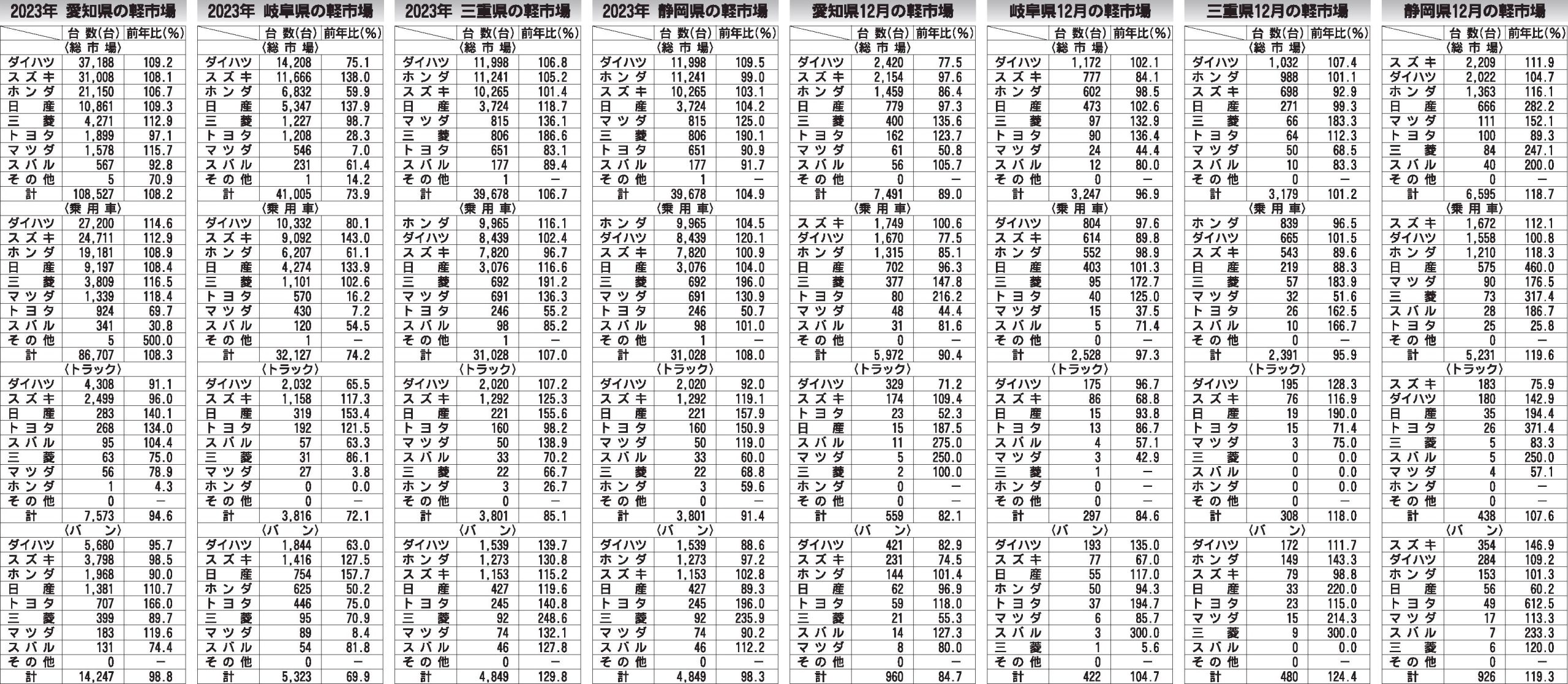 〈中部4県 2023年/2023年12月の軽市場〉愛知県/岐阜県/三重県/静岡県