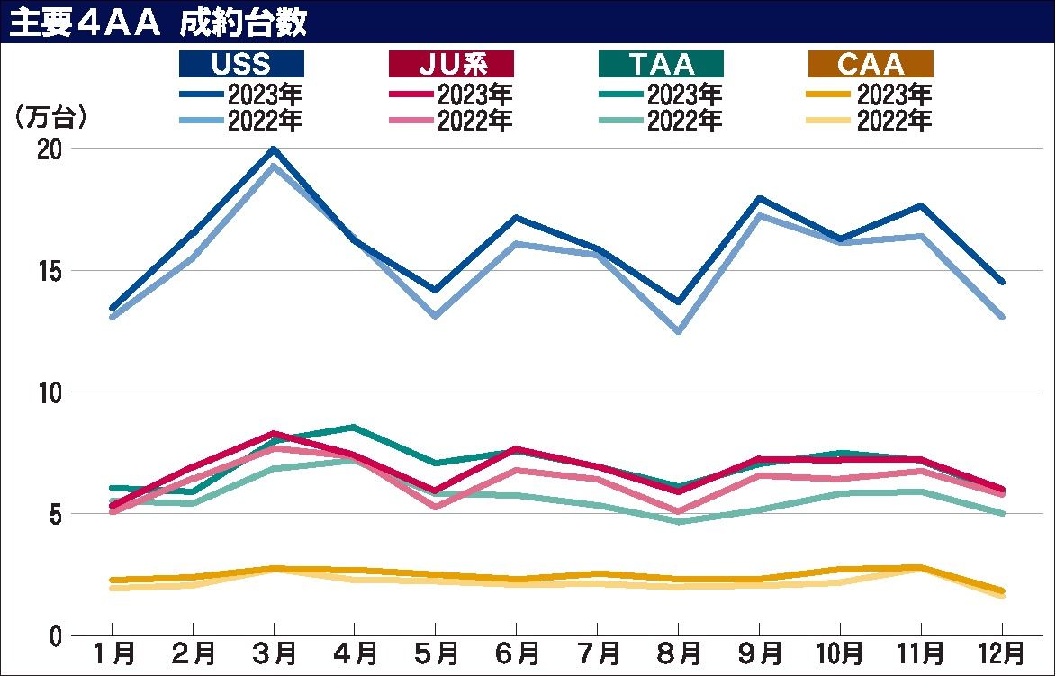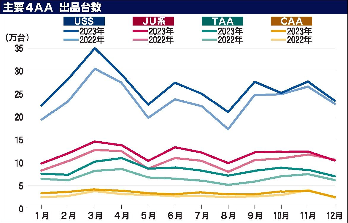 2023年(1~12月)の主要中古車オークションの実績がまとまった。23年のAAは、いずれも年明けから秋口にかけ出品台数がおおむね2桁増を記録した。これに比例して成約台数も前年を大きく上回る状況が続いたものの、成約率としては5㌽あまり下回...
