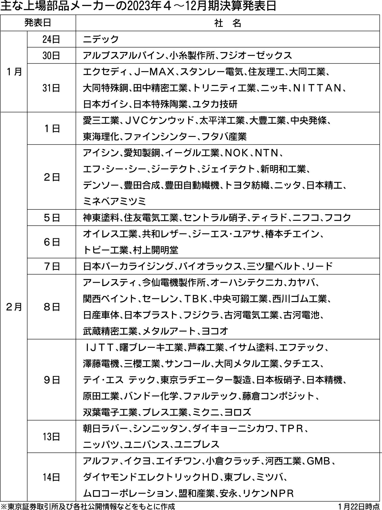 〈主な上場部品メーカーの2023年4~12月期決算発表日〉