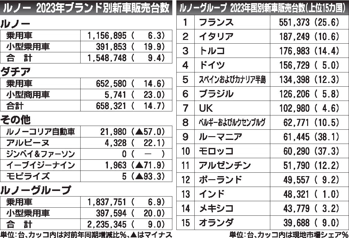ルノー・グループは、2023年の全世界新車販売台数が前年比9.0%増の223万5345台だったと発表した。最量販ブランドの「ルノー」が1割近く、「ダチア」「アルピーヌ」が2桁それぞれ増加したことでプラスを実現した。 地域別にみると、欧州で...
