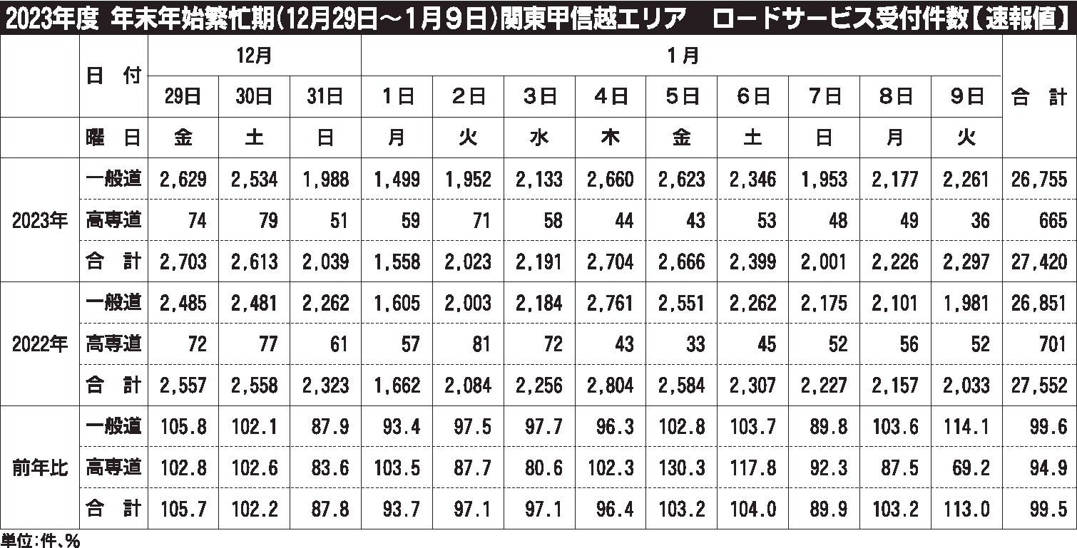 日本自動車連盟(JAF)関東本部(佐藤康彦本部長)は、年末年始期間中(12月29~1月9日)のロードサービス(RS)受付件数(速報値)を公表した。 期間中、関東甲信越エリア(新潟・長野・山梨・茨城・栃木・群馬・千葉・埼玉・神奈川・東京の1...