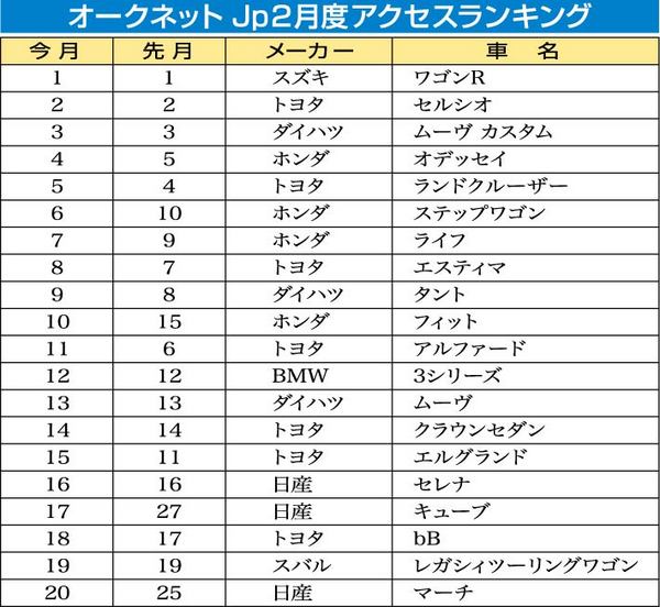 オークネット(藤崎清孝社長、東京都千代田区)は、消費者向け中古車情報検索サイト「オークネット・jp」の2月度車名別アクセス件数ランキング20を発表した。首位はワゴンRで、2007年10月から16カ月連続となった。2位はセルシオ、3位がムー...