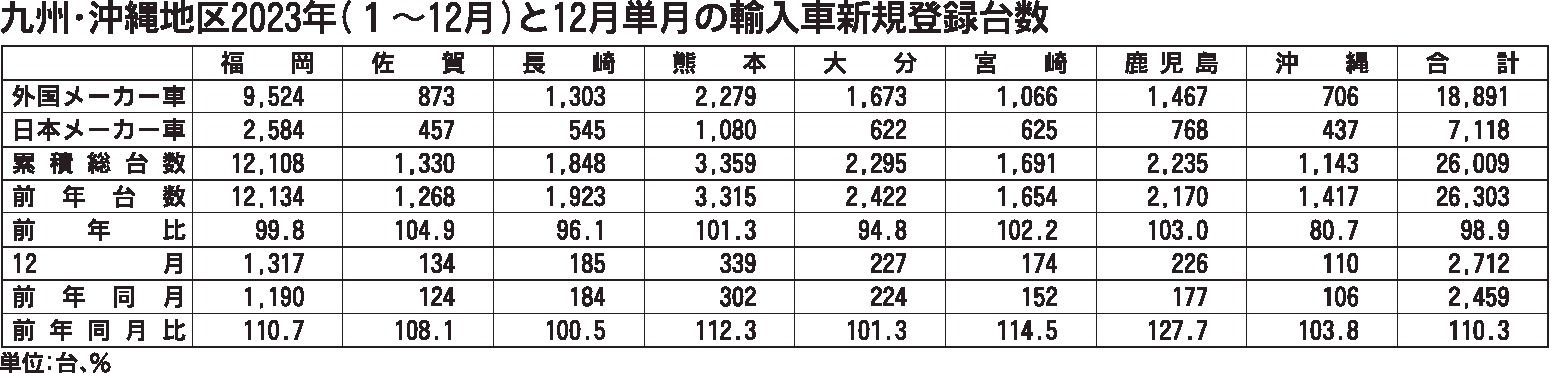 九州・沖縄地区の2023年(1~12月)の輸入車新規登録台数は、前年比1・1%減の2万6009台となり、微減ながら2年連続で前年実績を下回った。外国メーカー車が前年超えした一方、日本メーカー車は2桁減となり、全体でも前年超えには至らなかっ...