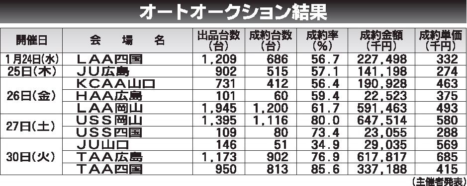 〈オートオークション結果〉中四国地区 2024/1/24~30