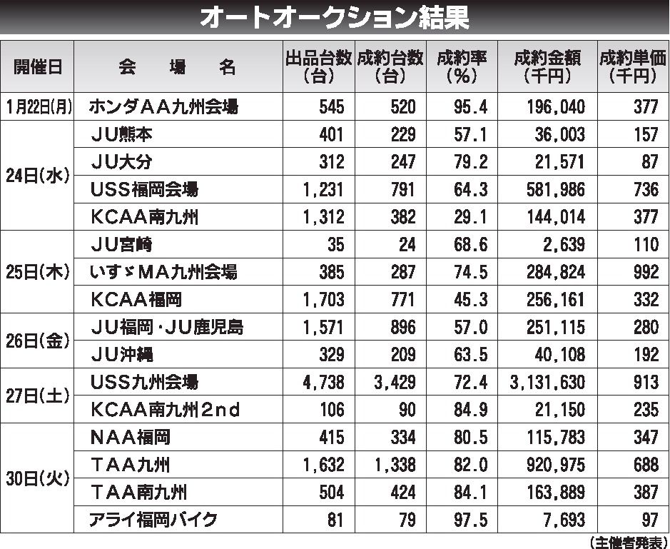 〈オートオークション結果〉九州地区 2024/1/22~30