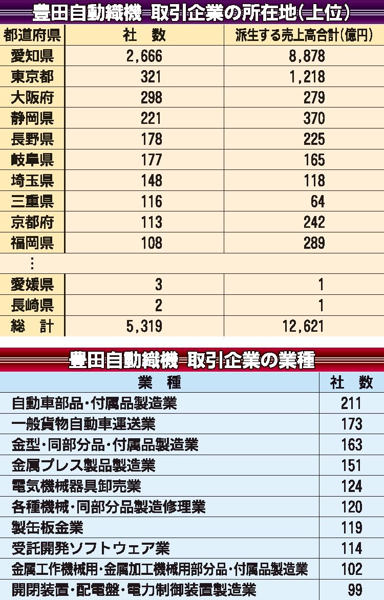 帝国データバンクは、豊田自動織機の認証不正を踏まえ、同社が持つサプライチェーン(供給網)に関する調査結果を公表した。国内の取引先は5319社(売上高1%以上を依存)に及び、売上高への影響額は総額1兆2621億円に達する。生産再開に時間がか...