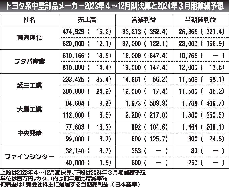 トヨタ自動車系中堅部品メーカー6社の2023年4~12月期連結業績は、トヨタの好調な車両生産を追い風に、全社が増収増益(黒字化含む)となった。東海理化、愛三工業、フタバ産業の3社は売上高と各利益項目で過去最高を更新した。一方で、外資系自動...