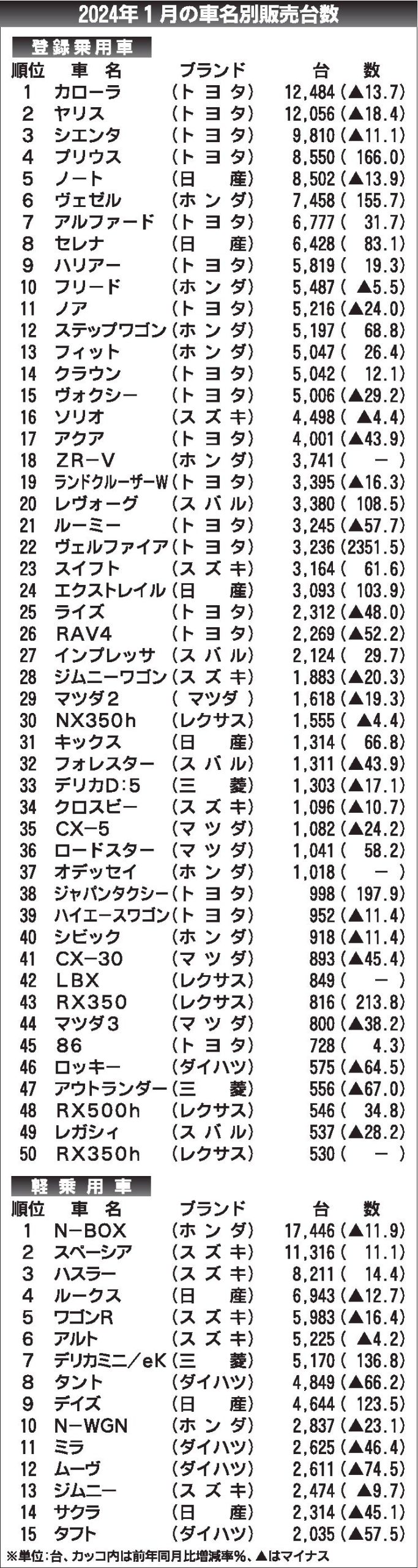 〈2024年1月の車名別販売台数〉