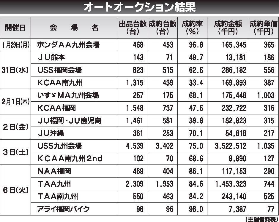 〈オートオークション結果〉九州地区 2024/1/29~2/6