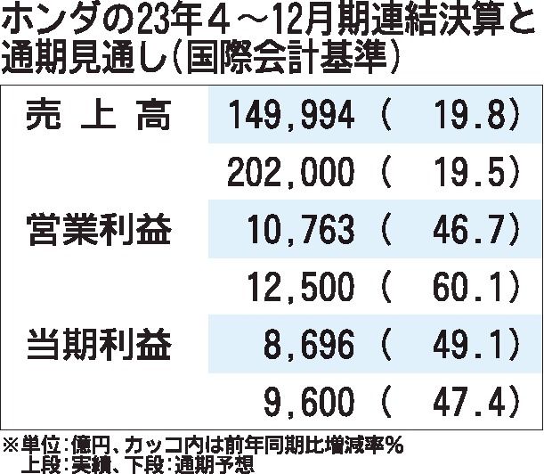 ホンダは8日、2024年3月期の連結業績予想(国際会計基準)を上方修正した。売上高にあたる売上収益を20兆2千億円(前回見通し比2千億円増)、営業利益を1兆2500億円(同500億円増)、当期純利益を9600億円(同300億円増)に修正した。中国などアジアでの業績悪化や品質関連費用の増加は収益を圧迫しているものの、円安や価格改定による効果などで業績見通しを引き上げる。業績予想値を実現すれば売上高と営業利益は過去最高を更新する。