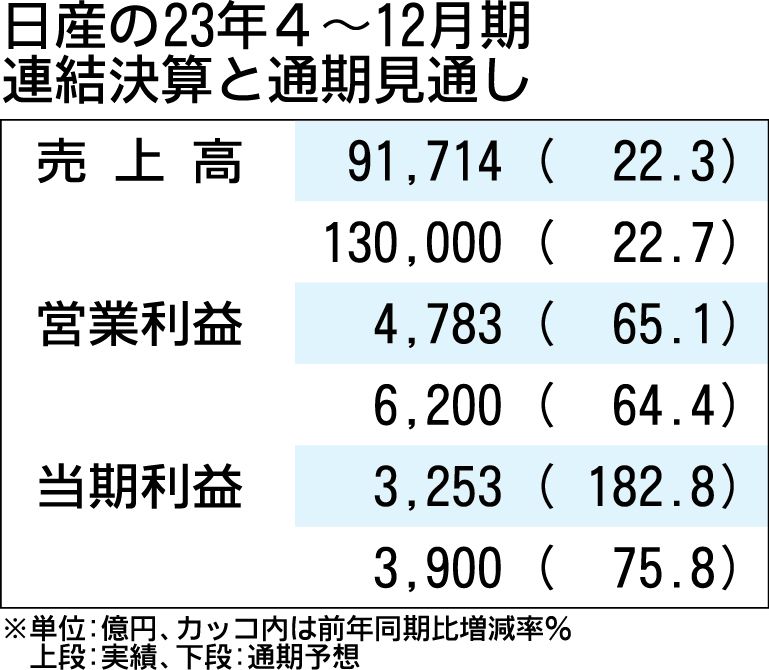 日産自動車は2月8日、2023年4~12月決算を発表した。売上高は前年同期比22.3%増の9兆1714億円、営業利益は同65.1%増の4783億円、当期純利益は同2.8倍の3253億円だった。北米など主要市場で販売台数が増加したことや、価格改定などで増収増益となった。通期業績予想は据え置いた一方で、販売台数見通しは物流網の混乱などを踏まえて下方修正した。