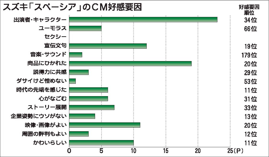 そのうち最もスコアが高かったのは、芦田が家族のスペーシアに乗せてもらう一幕を描いたCM。芦田が室内空間の広さや、オットマン(足乗せ用ソファ)として使用できる後部座席の「マルチユースフラップ」に「これ、すごいじゃないですか!」と声を上げると、うれしそうな表情を浮かべる柄本らに「いやいやいや」と謙遜され、心の中で「自慢されてしまった」とつぶやくストーリーだ。