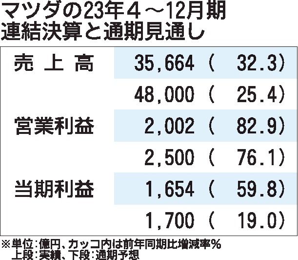 マツダが9日に発表した2023年4~12月期の営業利益は2002億円(前年同期比82.9%増)と、15年同期の1734億円を上回り、過去最高を更新した。品質費用の増加や物流費の上昇が収益を圧迫したが、販売台数の増加や高単価商品の比率上昇、円安の効果で大幅に利益を上積みした。売上高、当期純利益も過去最高を更新した。