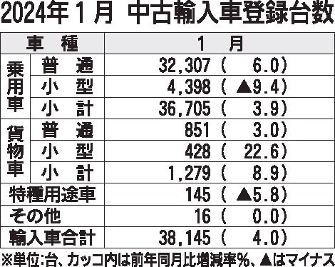 日本自動車輸入組合(JAIA、上野金太郎理事長)が13日発表した2024年1月の中古輸入車登録台数は、前年同月比4・0%増の3万8145台となり、2カ月連続のプラスだった。新車不足の改善によって、下取り車が増加し、中古車の供給が安定した。...