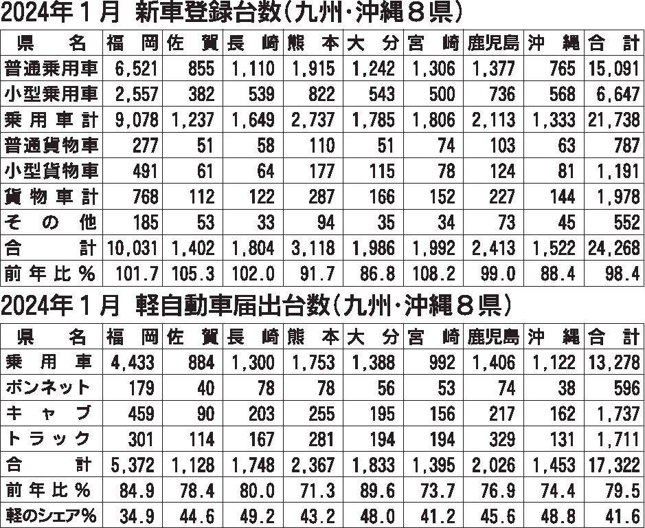 九州・沖縄地区の1月の新車販売台数(登録車と軽自動車の合計)は、前年同月比10・5%減の4万1590台となった。登録車、軽自動車ともに前年割れし、合計では17カ月ぶりに前年実績を下回った。軽自動車がダイハツ工業の出荷停止で大幅な減少を強い...