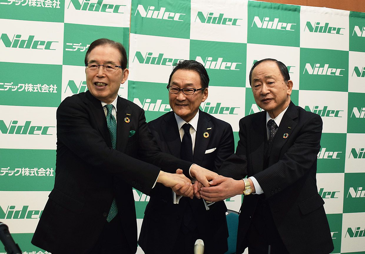 会見に同席した永守氏は「私と小部(博志社長)君は創業メンバーとして命をかけて会社を大きくしてきたが、そういう時代は終わった。次はサラリーマンの社長として役割分担を明確にし、組織だった形で仕事をする」と話す。