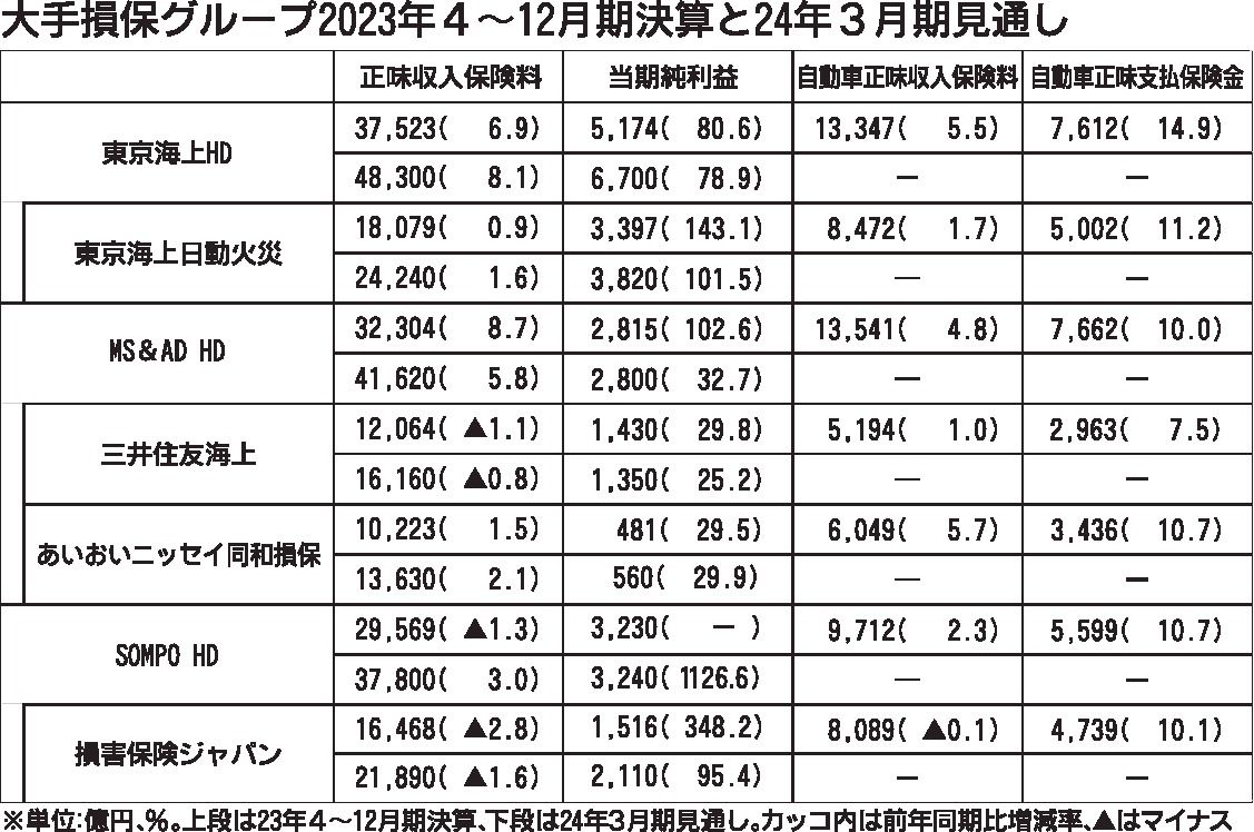 大手損害保険3グループが14日に発表した2023年4~12月期連結決算は、東京海上ホールディングスとMS&ADインシュアランスグループホールディングスの2グループが大幅増益となった。SOMPOホールディングスも前年同期の赤字から黒字に転換...