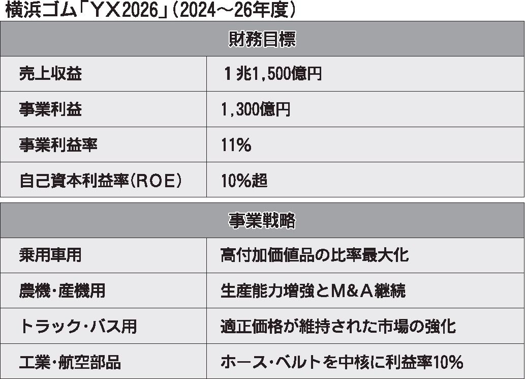 横浜ゴムは、2026年度までの3年間の新中期経営計画を策定し、事業利益を23年度約1・3倍の1300億円、利益率で11%を目指す。高付加価値製品の販売をさらに上積みし、乗用車用の旗艦ブランド「アドバン」は23年比で2倍以上の販売本数を目指...