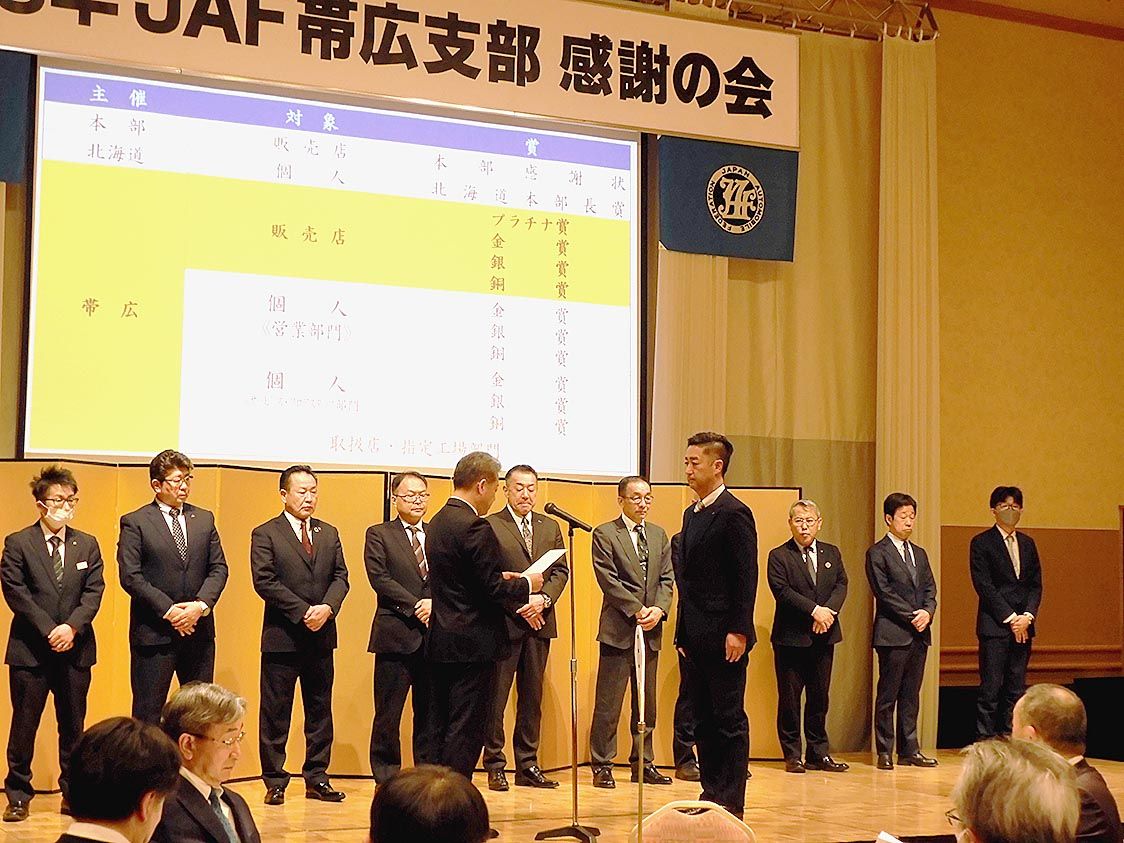 【帯広】日本自動車連盟(JAF)帯広支部(村松一樹支部長)は、市内のホテルで「感謝の会」を開催し、2023年の会員獲得実績が優秀だった法人と個人を表彰した=写真。個人の部(営業部門)では、釧路トヨタ西帯広店の鈴木勇伸さんが1位となった。同...