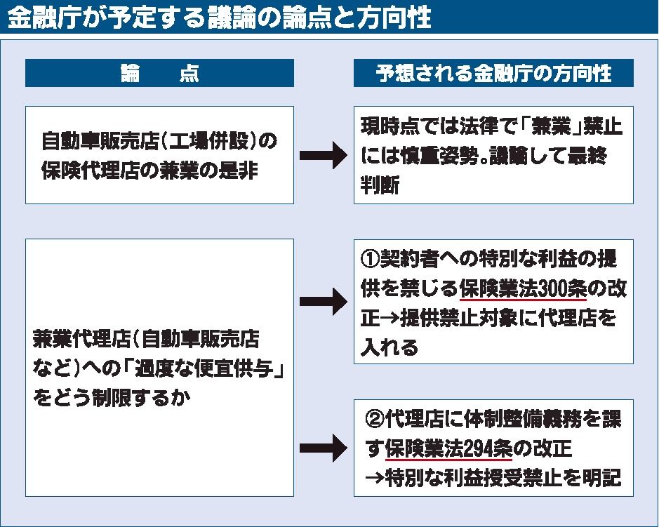 金融庁は、一部の自動車販売会社と損害保険会社の間で横行する「過度な便宜供与」といった商慣習を見直す議論を早ければ3月から始める。「保険代理店の兼業の是非」も話し合う方針だ。金融審議会(事実上金融担当相の諮問機関)か、有識者会議を新設して議...