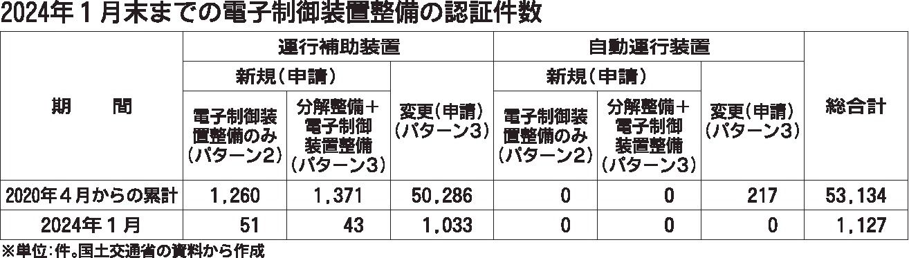 国土交通省がまとめた2024年1月の電子制御装置整備の認証件数は1127件だった。特定整備制度が施行した20年4月からの累計認証件数は、5万3134件(うち自動運行装置は217件)となった。認証取得の準備期間に当たる経過措置は3月末で終了...