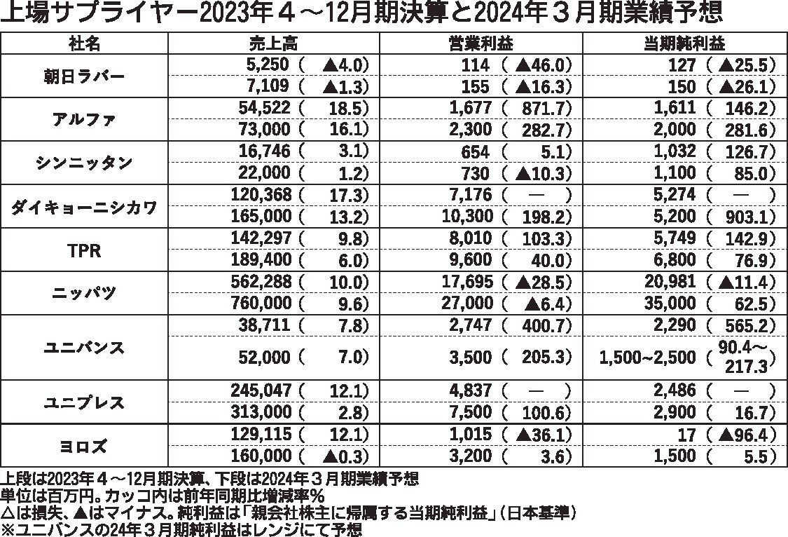 〈上場サプライヤー2023年4~12月期決算と2024年3月期業績予想〉(2/27付)
