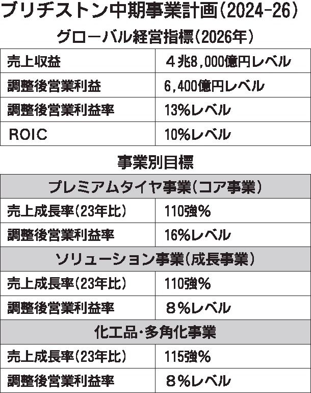 ブリヂストンは、2026年度までの新中期経営計画でプレミアムタイヤ事業をグローバルで強化し、調整後営業利益で23年比1.3倍の6400億円、最重要指標とする投下資本利益率(ROIC)は10%を目指す。タイヤの真円度を3割高める技術を世界の...