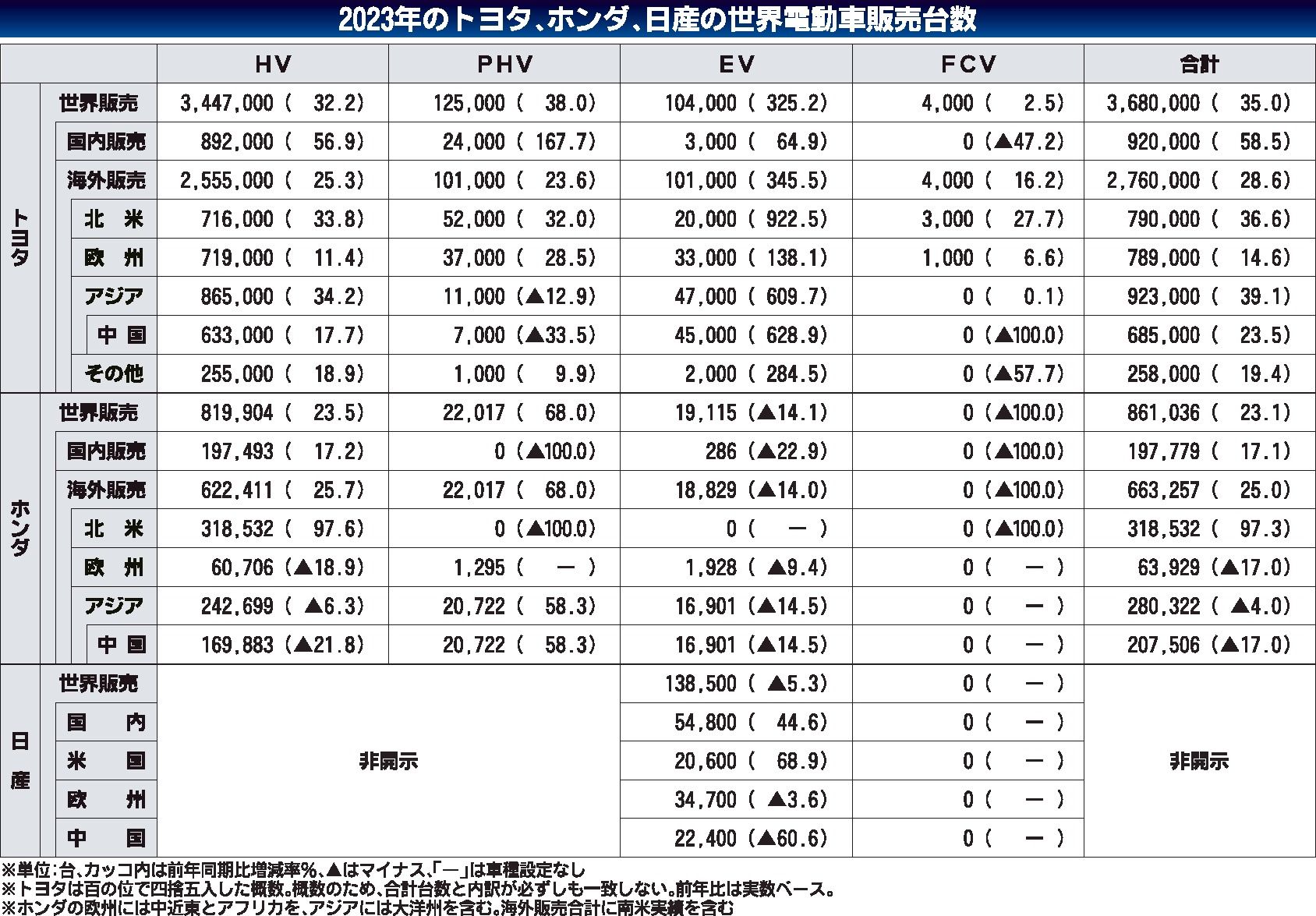 日本の大手自動車メーカー3社による2023年の国・地域別電動車販売(日産自動車は電気自動車のみ)がまとまった。暦年ベースの電動車比率で、トヨタ自動車が初めて3割、ホンダが2割をそれぞれ突破した。ガソリン高を背景に北米などでハイブリッド車(...