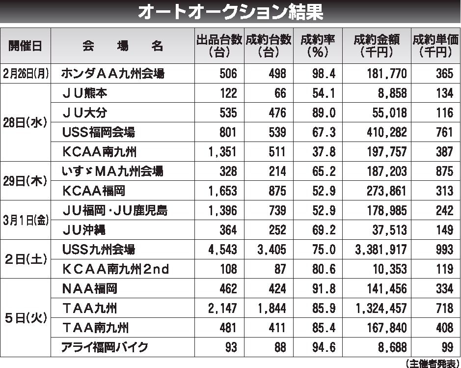 〈オートオークション結果〉九州地区 2024/2/26~3/5
