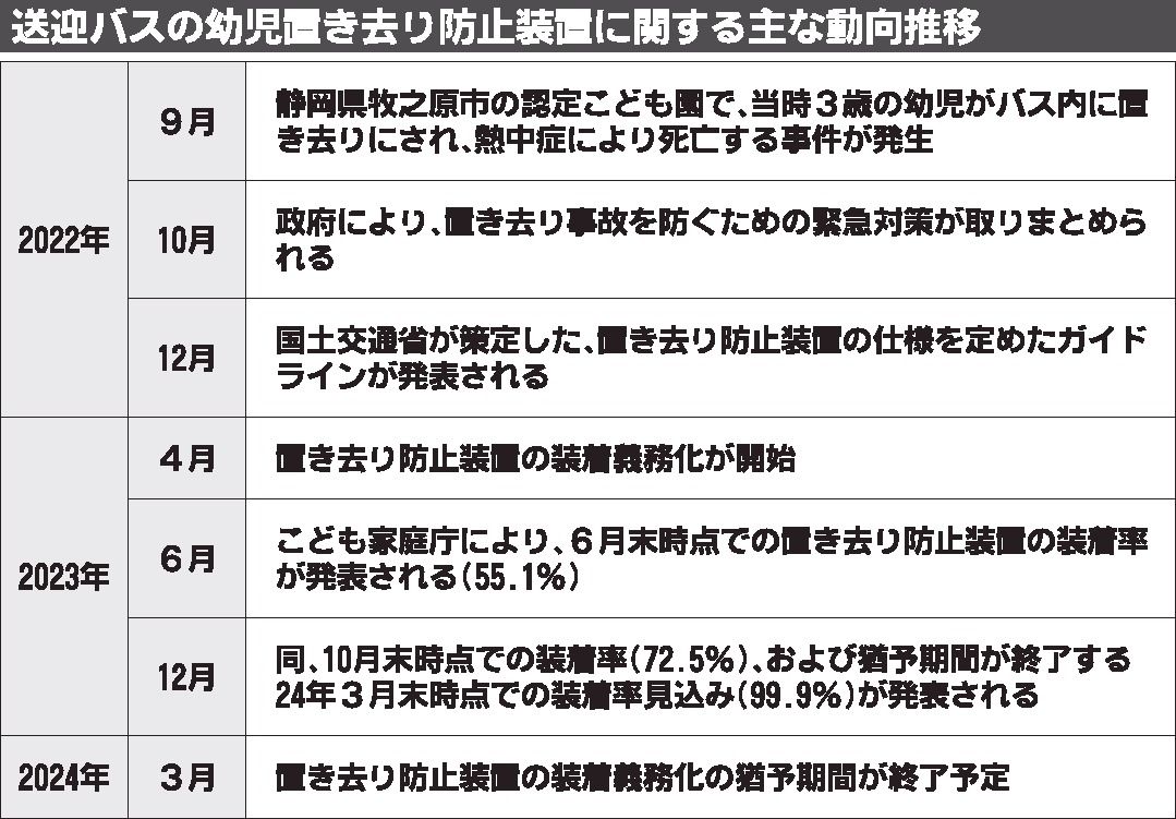 送迎バスの幼児置き去り防止装置で、装着義務化の猶予期間の終了が3月末に迫っている。こども家庭庁では、対象車両の5万4345台に「100%装着される」としている。ただ、同庁が2023年12月に公表した資料では同月末での装着見込みは全体の85...