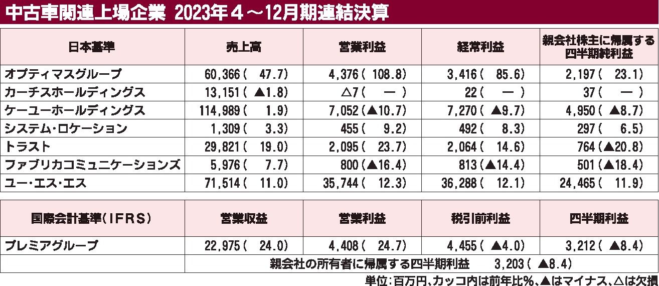 中古車関連の上場企業のうち4月から翌年3月を事業期間とする企業8社の2023年4~12月期決算は、7社が増収だったが、増収増益は3社にとどまった。 小売業では、カーチスホールディングスが自動車流通事業において、ユーザーと直接取引する「買取...