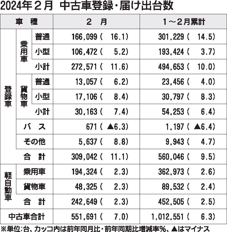 自販連がまとめた2月の中古車登録台数は前年同月比11.1%増の30万9042台となり、11カ月連続で前年超えした。このうち乗用車は同11.6%増の27万2571台で、普通乗用車と小型乗用車がともに伸びた。貨物車は同7.4%増の3万163台だったが、バスは同6.3%減の671台にとどまった。