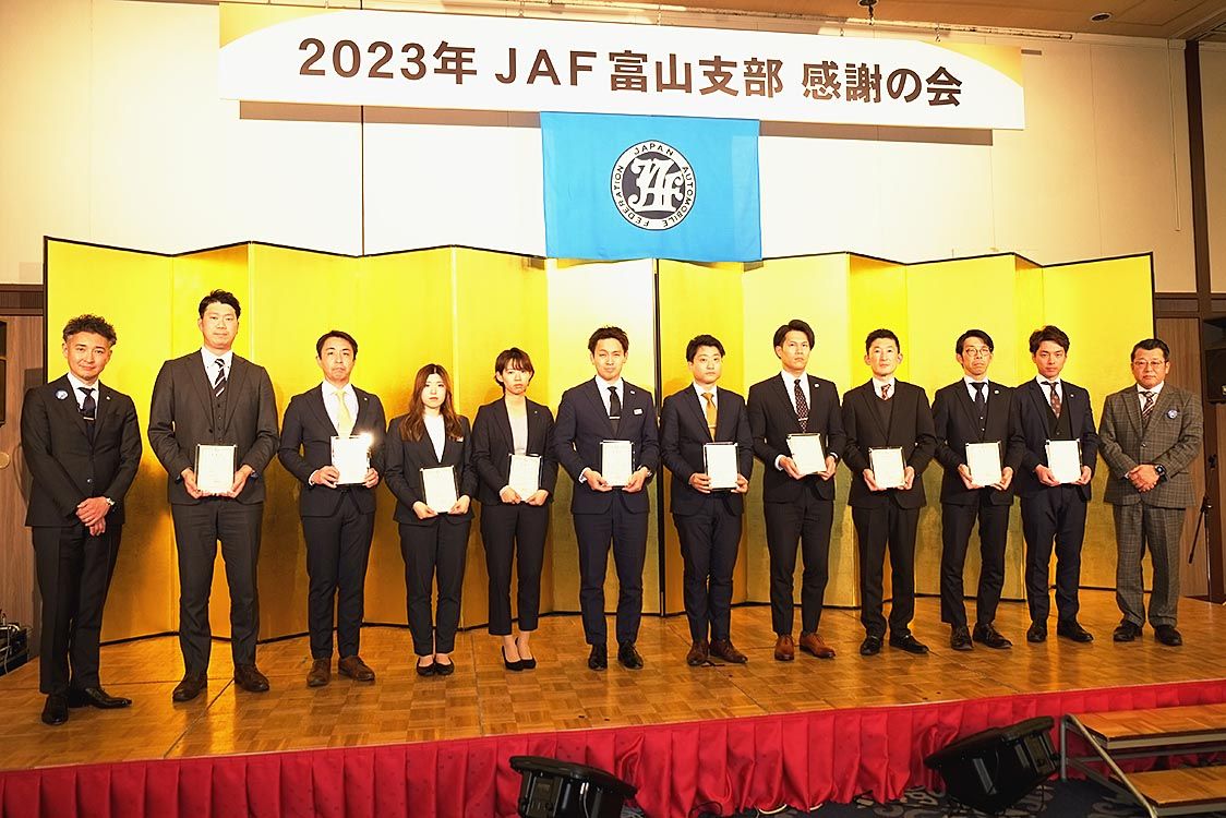 【富山】日本自動車連盟(JAF)富山支部(笹山泰治支部長)は、JAFの会員拡大で優れた功績を残したディーラーや社員を表彰する「2023年JAF富山支部感謝の会」を、富山市内のホテルで開催した=写真。23年の同支部新規入会件数は前年比4・4...