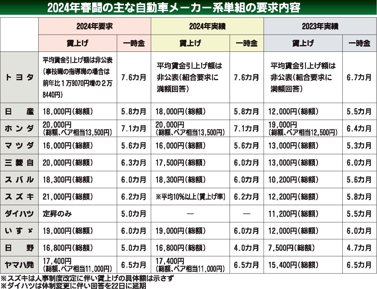 2024年の春季労使交渉(春闘)が13日、自動車メーカーの一斉回答日を迎えた。満額回答で早期に妥結していたホンダなどに加え、13日はトヨタ自動車、日産自動車、スバル、日野自動車が賃上げ要求に満額回答した。物価上昇分を超える5%超の賃上げに...