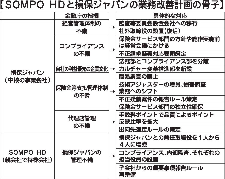 親会社のSOMPO HDについては、結果的に子会社の重要な情報が上がらなかったことが問題視されていた。子会社からの重要事項報告ルールを再整備するとともに、リスク関係の情報を子会社と共有しやすくするために、コンプライアンス(法令順守)、内部監査担当役員を設置する。