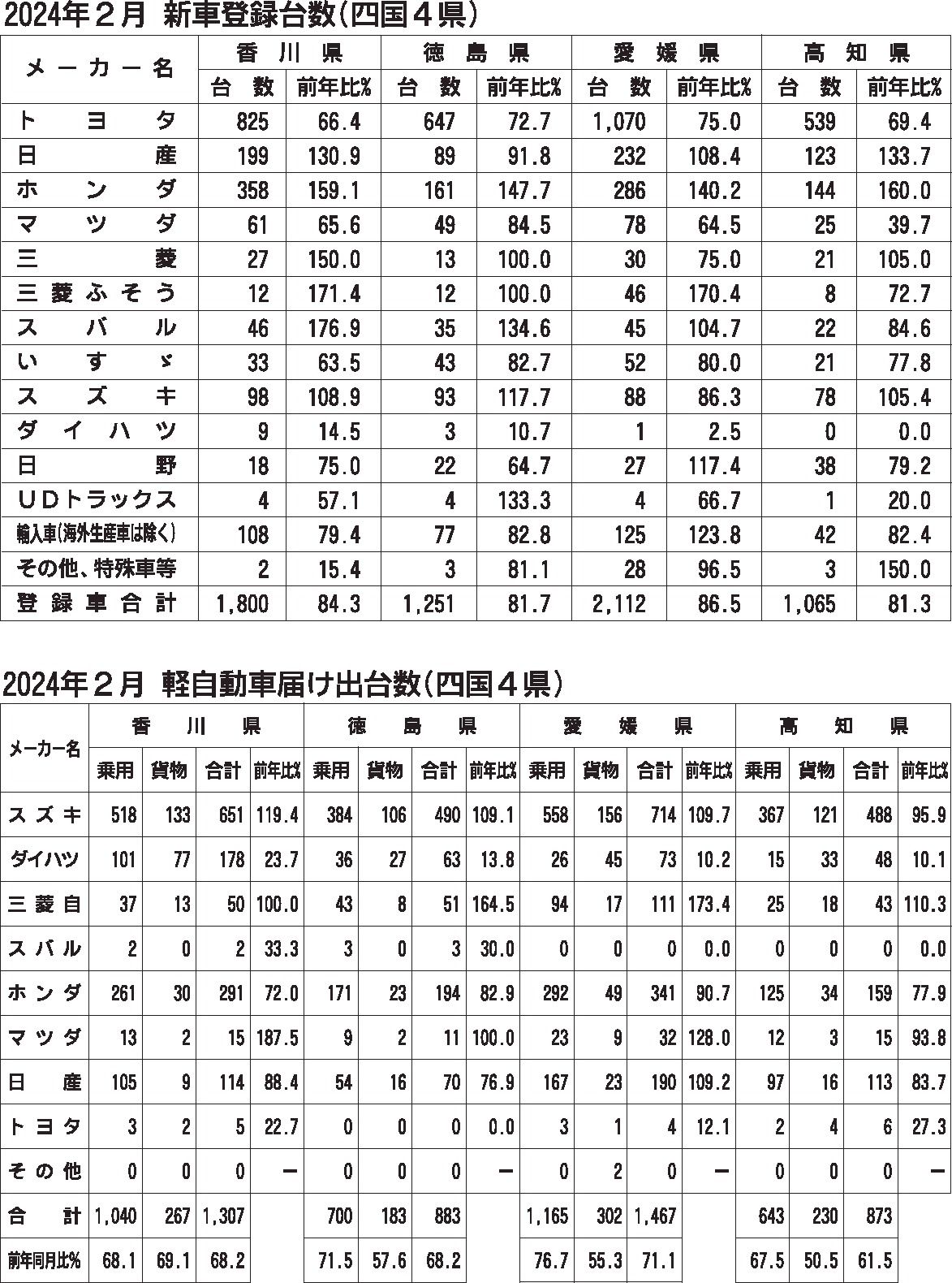 四国地区の2024年2月の新車販売台数(登録車+軽自動車)は、前年同月比23・8%減の1万766台と2カ月連続の減少となり、前月から減少幅は7・2㌽広がった。市場をけん引するトヨタの販売台数が前年実績から3割の落ち込みを示したほか、ダイハ...