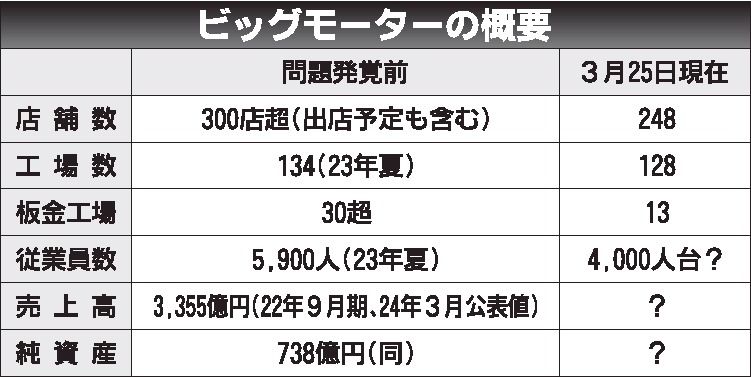 伊藤忠商事など3社連合による買収が決まったビッグモーター(和泉伸二社長、東京都多摩市)について、現在の店舗や整備工場、従業員は原則的に新会社がすべて引き継ぐ見通しであることが分かった。ただ、新会社への移行後は一部拠点の閉店など、店舗網を再...