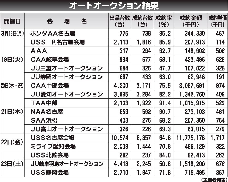 〈オートオークション結果〉中部地区 2024/3/18~23